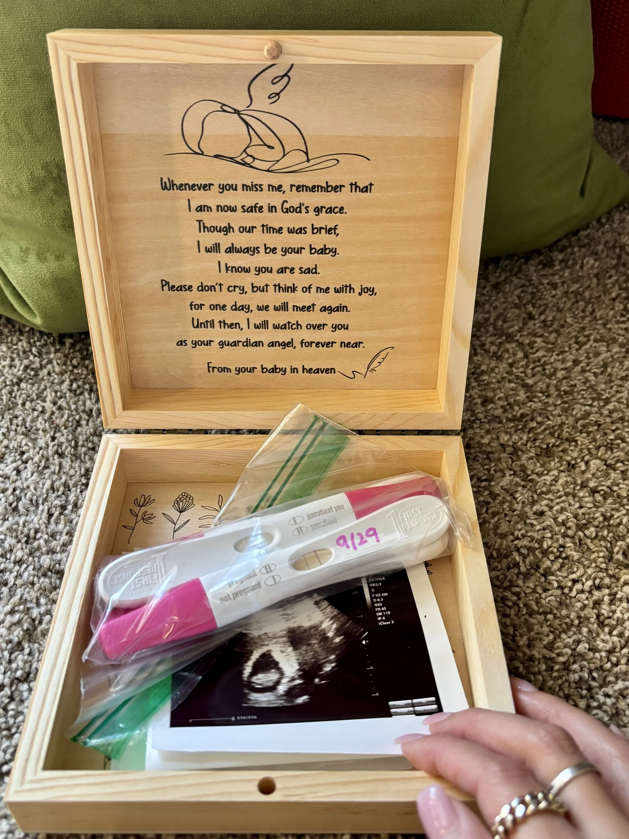 Before closing, I want to thank my mom for sending us this beautiful keepsake box! Something I’ll cherish forever. Inside it is my pregnancy test, ultrasound photo, and a message that touched our souls.